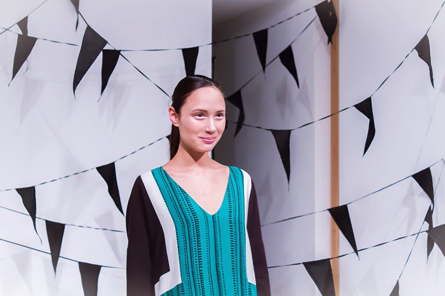 Earlier this week I was lucky enough to get to go to the Edeline Lee SS14 presentation (thanks Sophie!), particularly as it was one I missed during the hectic days of fashion week. The looks were showcased in a set of side-by-side white rooms, floating black balloons & bunting strung up from corner to corner. With the dulcet tones of an a cappella choral singer haunting the room, the girls drifted slowly & pensively amongst one another & we got to see the beautiful collection that was on show. Mint green sleeves with monochromatic check board drop-waist skirts in silk made up one look, whilst others were in soft grey, heavier dresses, pleated & with ikat blue & white designs breaking up the block colour. One thing I love about Edeline Lee is that the clothes are just so pretty & so wearable; I'll definitely be coming back for more next season!